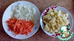 Крупу заранее замочить часа на 2-3. Мясо и картофель, перловку отправляем в кастрюлю и варим до готовности крупы. Морковь и лук обжариваем.