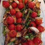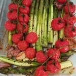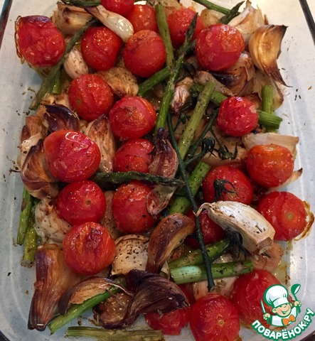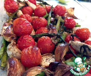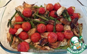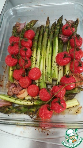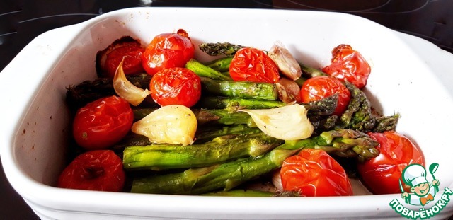 Достаньте чеснок. Наколите каждый помидорчик вилкой, добавьте спаржу и снова немного оливкового масла. Поперчите!!! И снова в духовку. Еще мин на 30! Смотрите, как у вас печет духовка. Помидоры должны подвалиться. Чеснок подрумянится еще больше.