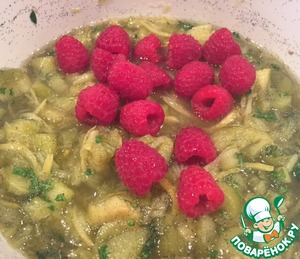 Смело приступаем к начинке. В сотейник всыпьте сахар, добавьте зерна одного стручка ванили и всыпьте очищенный и порезанный на дольки ревень. Цедру лимона нарежьте лапшой и добавьте к ревеню. Дальше время малины и мяты с мелко нарезанным розмарином! И кубиком нарежьте одно яблоко и смело поварите все вместе!