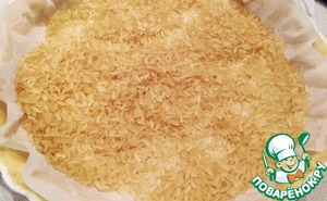 Достаньте тесто. Теперь его удобно резать тонкими пластами и выкладывать в форму! Поверх теста постелите бумагу для выпечки и насыпьте крупу. Тесто следует выпекать 7 мин при температуре 160 гр.