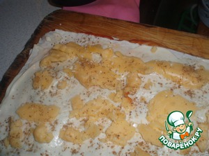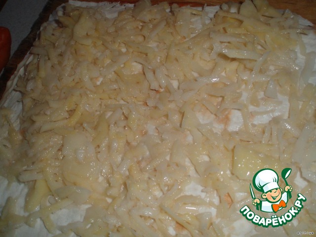 Закрыть листом, смазать маслом и посыпать тертым картофелем