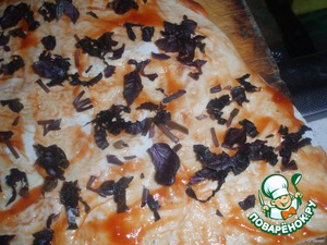 Закрыть листом, смазать кетчупом, посыпать зеленью