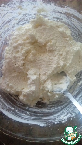 Добавляем во взбитый белок творог,2 ст. л. муки и 1 ст. л. сметаны, пакетик ванилина. Все перемешиваем и начинка готова.