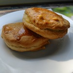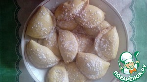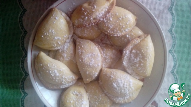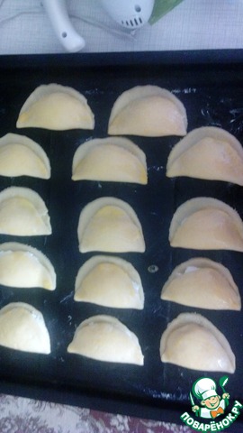 На кружочки выложить начинку, сложить наполовину и залепить края. Тестовые заготовки смазать оставшимся желтком и выпекать в духовке 15-20 минут при температуре в 200 градусов.
