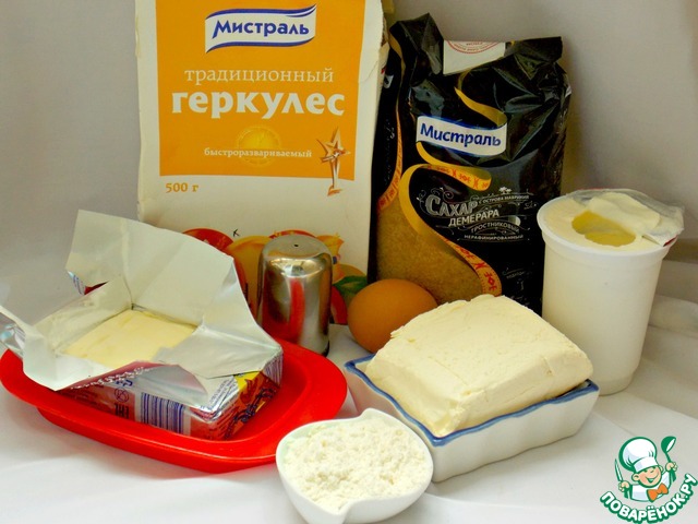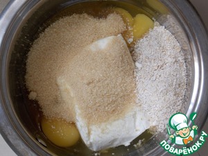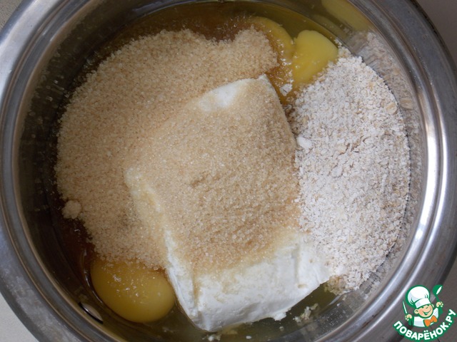 В первую очередь сделаем начинку. Сначала смолоть хлопья в муку. Положить все для начинки в миску и хорошенько перемешать. Тут есть одна тонкость. Если Вы хотите, чтобы начинка была более творожной, то положите только одно яйцо. Если хотите, чтобы она больше напоминала суфле и впиталась в тесто, то два. Но учтите, что она после этого будет жидковата.