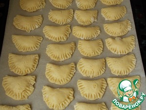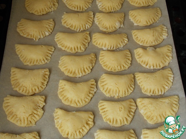 Размять тесто руками в круг. Положить начинку в середину и сложить. При помощи вилки, прижимая зубцами края, защипываем их. Уложить на противень, застеленный пекарской бумагой. Яйцо смешать с водой и смазать верх печенья.