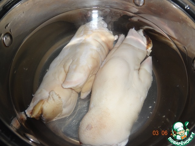 Первым делом нужно хорошо очистить и промыть копытца. Затем залить водой и поставить на огонь. Как только бульон закипел, сливаем воду и ставим снова варится. При необходимости нужно снять пену.