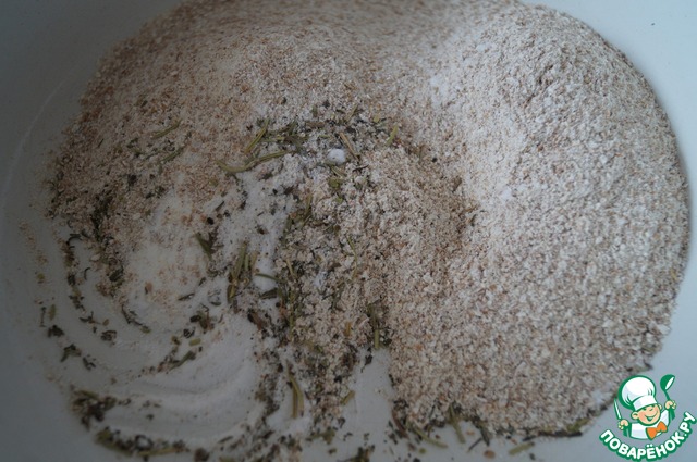 Смешиваем сухие ингредиенты: муку, соль, разрыхлитель, сахар и 1ч. л Прованских трав.