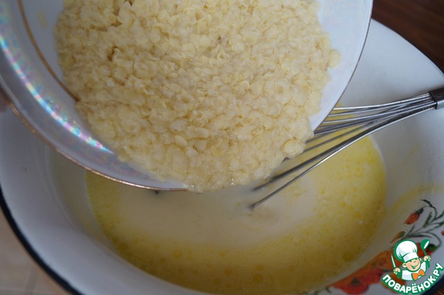 Затем в мисочке венчиком слегка взбиваем яйца, добавляем оливковое масло и молоко. Потом высыпаем туда пшенные хлопья и хорошо перемешиваем.
