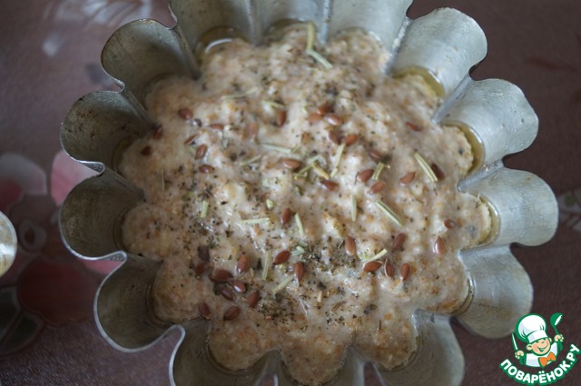 Готовое тесто выливаем в формы. У меня к сожалению нет формочек под маффины, поэтому я использовала формы под кексы, они для маффинов большеватые ( Сверху посыпаем маффины оставшимися прованскими травами и семенами льна.