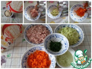 Отмеряем нужное количество хлопьев. Куриное мясо, капусту, лук и морковь пропускаем через мясорубку. Нарезаем зелень.