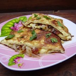 Сковороду немного смажьте оливковым маслом, влейте яйца и обжаривайте с одной стороны. На одну половинку омлета положите лук и прикройте другой.