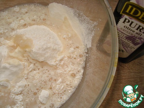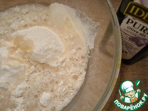 В муку добавим дрожжевую смесь. Вольем 1 ст. ложку оливкового масла. -