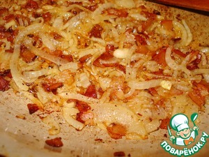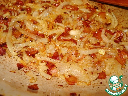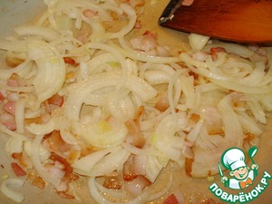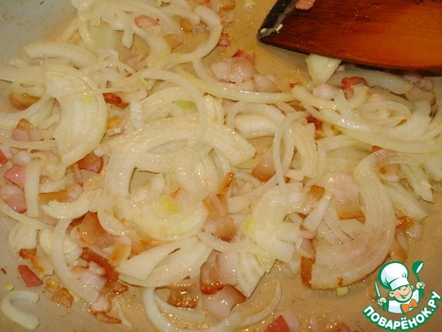 Займемся начинкой: бекон нарежем небольшими кубиками и на сковородке обжарим. Как только жир начнет выделяться, добавим лук, нарезанный тонкими полукольцами.
