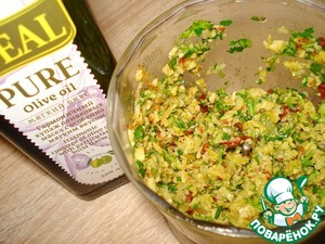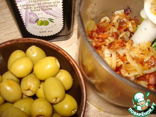В чашу блендера добавим оливки, петрушку и обжаренный лук с беконом.