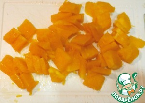Тыкву режем маленькими кусочками. Если у вас тоже замороженная, предварительно разморозить