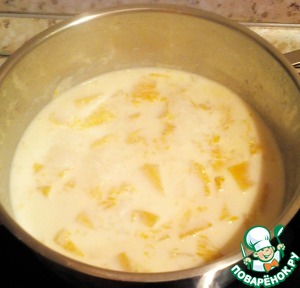 Доводим до кипения подсоленное молоко, опускаем тыкву и, если кипеть перестало, снова доводим до кипения.