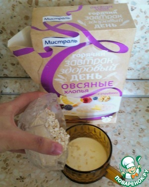 На одну порцию берем 2-3 ст. л. хлопьев и заливаем 1/3 стакана молока -