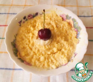 Если вы не добавляли при варке сахар, то подаём кашу со сгущёными сливками - это очень вкусно! Украшаем по желанию черешенкой...