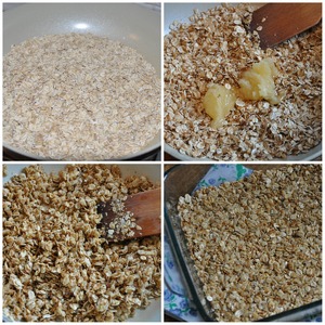 Овсяные хлопья обжарить на сухой сковородке до легкой золотистости. Снять с огня смешать с медом и маслом. Выложить в разъемную форму или контейнер, застеленный пергаментом. А ещё лучше использовать квадрат для формовки салата.