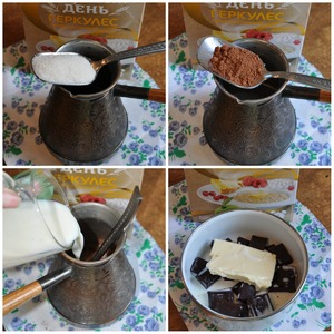 2. В турке смешать сахар, какао, 100 г. молока. Дать закипеть и проварить 1 мин.