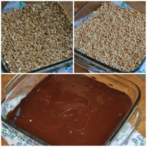 На овсяную основу поверх рассыпать арахис. Шоколадную заливку выкладываем на основу с арахисом. Убираем в холодильник на пару часов.