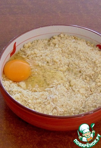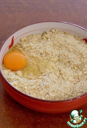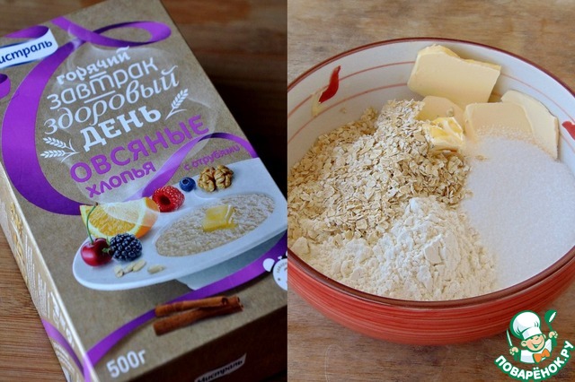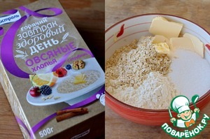 Растереть в крошку масло комнатной температуры с сахаром, хлопьями и мукой.