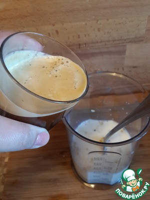 Если нет кофемашины или капучинатора - не беда!!! Налейте холодное молоко в стакан от блендера, и с помощью погружной насадки взбивайте. Оно сверху взобьется в пенку. Эта пенка будет менее устойчива, но всё же пенка!! С помощью ложки выкладывайте образующуюся пенку на коктейль и опять взбивайте молоко, пока не будет пенки.