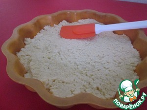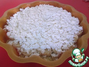 Теперь ровненько посыпаем сверху творогом. У меня домашний. Делала и с магазинным, тоже вкусно! Чуть-чуть приминаем сверху лопаткой или ложкой, выравнивая поверхность.