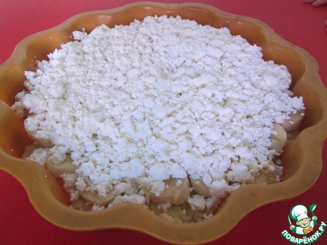• Теперь ровненько посыпаем сверху творогом. У меня домашний. Делала и с магазинным, тоже вкусно! Чуть-чуть приминаем сверху лопаткой или ложкой, выравнивая поверхность.