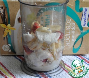 Банан и зефир отправьте в блендер к хлопьям. К этим ингредиентам отправьте клубнику.