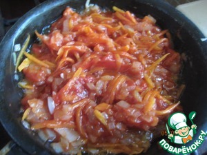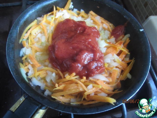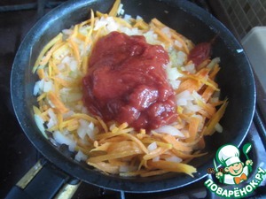 Пока варится мясо, делаем зажарку, для этого порезанные лук и морковь кладем в сковородку, без масла, но наливаем немного бульона где варится мясо