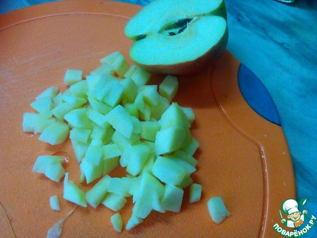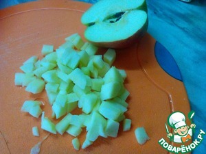 Пол-яблока нарезать на кубики, предварительно очистив от кожуры, вторую часть можно использовать для украшения вместо клубники