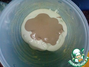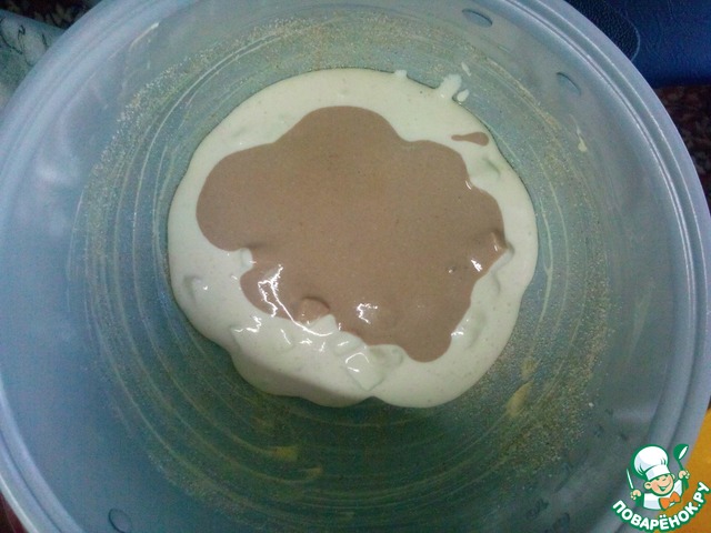 В предварительно промазанную чашу мультиварки сливочным маслом и присыпанную манкой, по очередности выливаем нашу смесь, начиная с белой