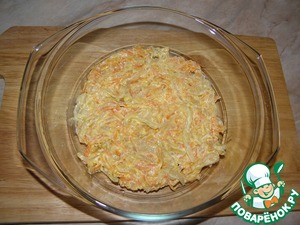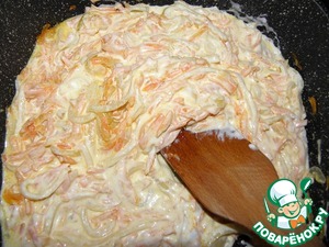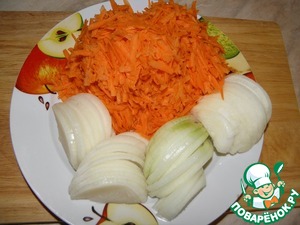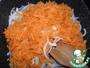 Разогреть растительное масло, выложить нарезанный лук, чуть обжарить, добавить к нему морковь и еще чуть обжарить.