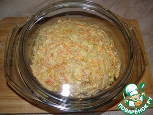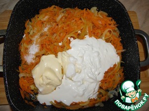 К луку и моркови добавить сметану, майонез, сахар, уксус, соль, все перемешать