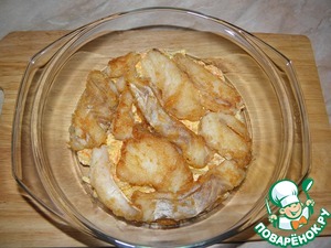 Затем на рыбу снова часть маринада, и так слоями, пока у вас не закончится рыбка и маринад. Верх должен быть весь укрыт маринадом. ( у меня, если рыбы грамм 700, получается 2 слоя рыбки, и три слоя маринада)