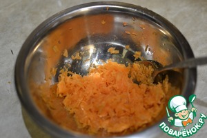 Трем морковь на мелкой терке и перетираем с чайной ложкой сахара и отставляем.