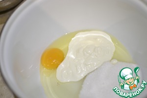 Яйцо, сахар, сметану слегка взбить, добавить соду