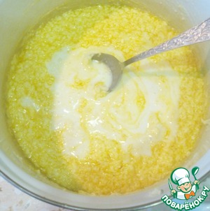 Влить остальной кефир, перемешать. Кстати, вообще не обязательно было взбивать всё в начале, просто так быстрее. Можно всё смешивать венчиком или ложкой