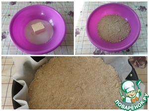• В рабочую чашку высыпаем просеянную муку, муку из овсяных хлопьев, разрыхлитель теста, щепотку соли, ванилин, половину подготовленного сахара. Добавляем маргарин. Делаем тесто-крошку.