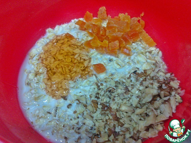 • По истечении времени добавляем теплое молоко (или сливки). Орехи раздробить, курагу мелко нарезать и всё добавить в кашу. Заправить кашу медом и тщательно перемешать.