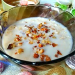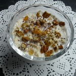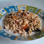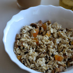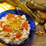 По истечении времени добавляем теплое молоко (или сливки). Орехи раздробить, курагу мелко нарезать и всё добавить в кашу. Заправить кашу медом и тщательно перемешать.