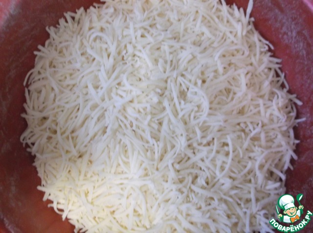 Пока тесто в холодильнике начинаем делать начинку. В отдельную емкость натереть сыр. Добавить муки и хорошенечко перемешать.