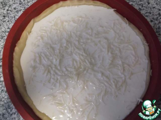 Сыр высыпаем росным слоем на тесто. Затем заливаем сыр желтками со сливками. -