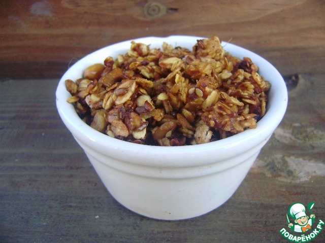 "Гранола – родственник мюсли. Ее готовят из злаков и едят на завтрак. Она содержит расплющенную овсяную крупу (хлопья геркулес), различные орехи, мед, иногда рис и сухофрукты. Этот полуфабрикат для завтрака предварительно запекают в духовке, помешивая, чтобы не слиплась. Запекание придает дополнительный вкус всем компонентам, раскрывает ароматы.Вобщем ,Гранола – вкуснее, чем просто каша.