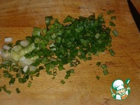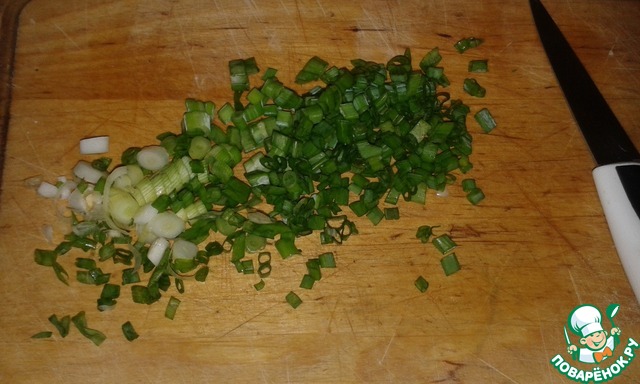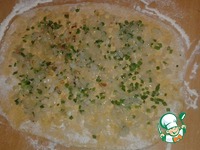 Подошедшее тесто раскатать в прямоугольник и выложить на него репчатый и зеленый лук |