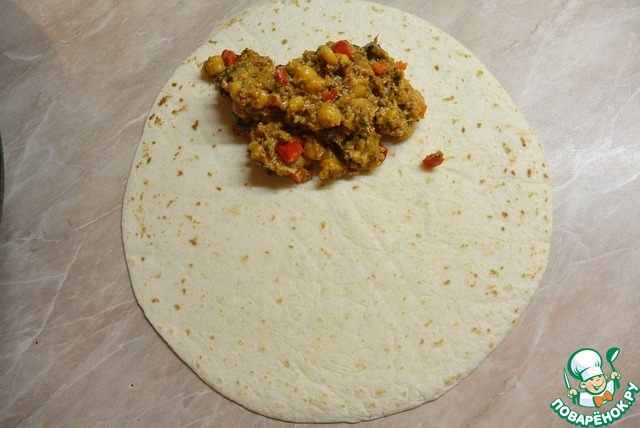распределяем ее по всей поверхности половины лепешки. Слой должен быть не слишком толстый, иначе начинка вылезет. Накрываем второй половиной лепешки. И так каждую.