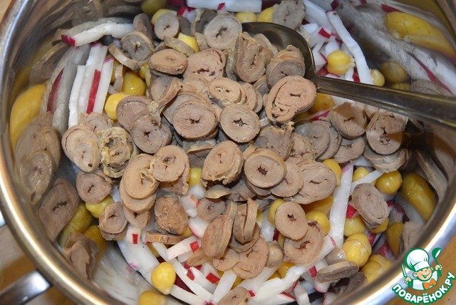 Отварить сердечки в подсоленной воде и нарезать кольцами. Добавить в кастрюлю к другим ингредиентам.