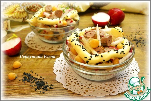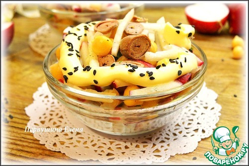 Разложить салат в порционные тарелочки. Подавать с майонезным соусом, украсив кунжутом!